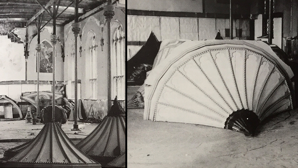Rectangular in plan, the Chapel was divided into a nave and two side aisles surrounded by stained glass windows. It was superbly decorated in a neo-Gothic style with a decorative (as opposed to structural) fan vaulted ceiling in wood supported by slender marbled cast-iron columns with an intricately carved wooden altar screen.