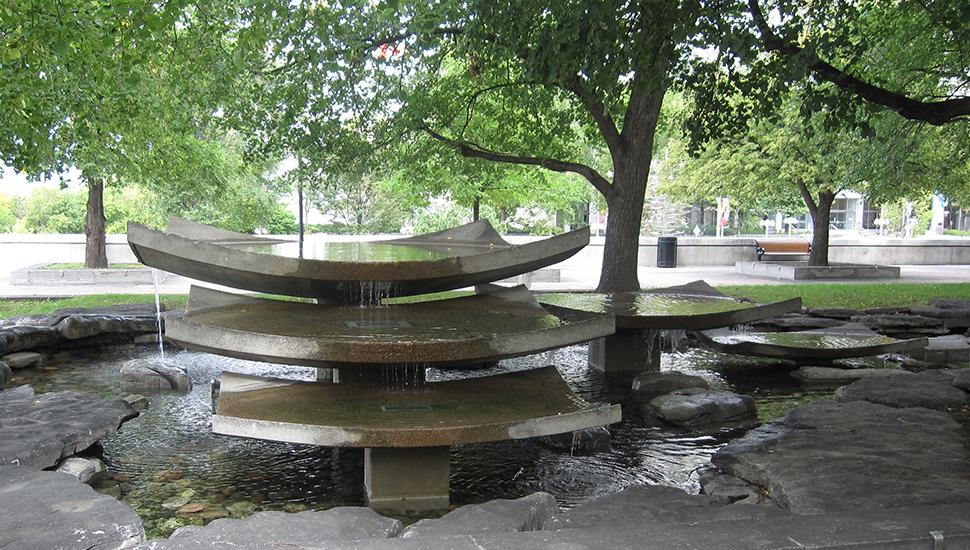 On the west side of the upper terrace is a sculptural fountain entitled Great Lakes, designed by landscape architect Emil G. Vandermeulen with consulting engineers Adjeleian and Associates.
