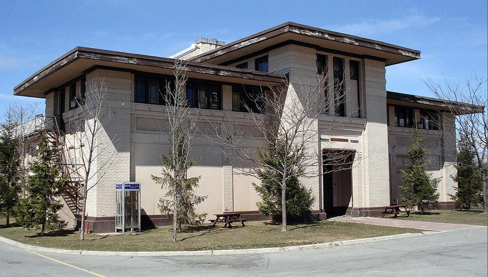 The Horticulture Building is an excellent interpretation of the Prairie style pioneered by Frank Lloyd Wright (1867-1959), as illustrated by its rectilinear massing, symmetrical composition, strong corner piers, slab-like roofs with broad cantilevered wood cornices, band of clerestory windows with geometric glazing patterns, horizontal stone banding, and minimal but stylized ornamentation.