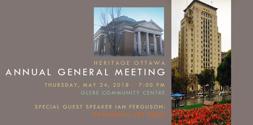 Heritage Ottawa invites members and their guests to attend its Annual General Meeting on Thursday, May 24 at the Glebe Community Centre, beginning at 7:00 pm.