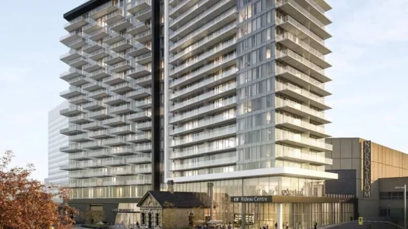 Designed by Toronto-based Zeidler and Montreal’s Neuf architects, the proposed highrise would include 280 apartment suites in a mix of one- and two-bedroom units as well as about 2,500 square feet of ground-floor retail space. An enclosed pedestrian walkway would connect the building to the Rideau Centre.