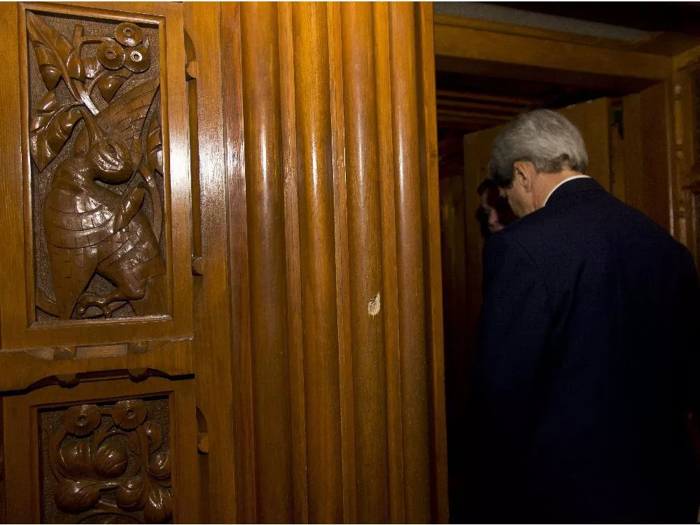 Photo: Bullet hole visible in the wood frame at an entrance to the Library of Parliament.