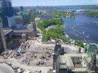 The unique bronze statue of Pearson, unusual because he is portrayed sitting on a chair as he looks out over Parliament Hill, is now entirely covered by heavy grey plywood, on the same spot it was before giant excavators, gravel trucks and a massive construction crane moved in only 20 metres away.