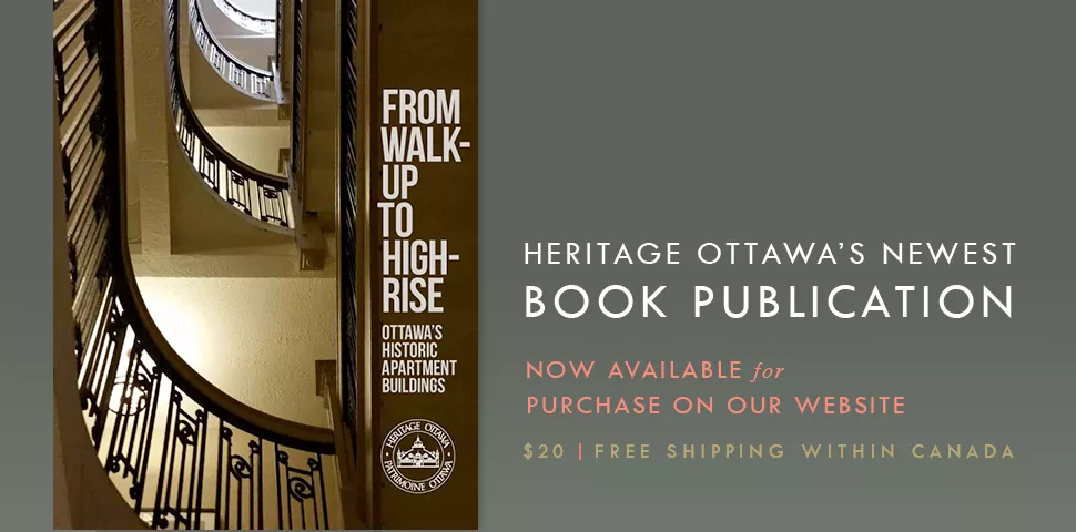 FROM WALK-UP TO HIGH-RISE: Ottawa’s Historic Apartment Buildings, edited by Carolyn Quinn. ISBN: 978-0-9682295-3-8; 80 pages with extensive colour photographs. Published by Heritage Ottawa, 2017.