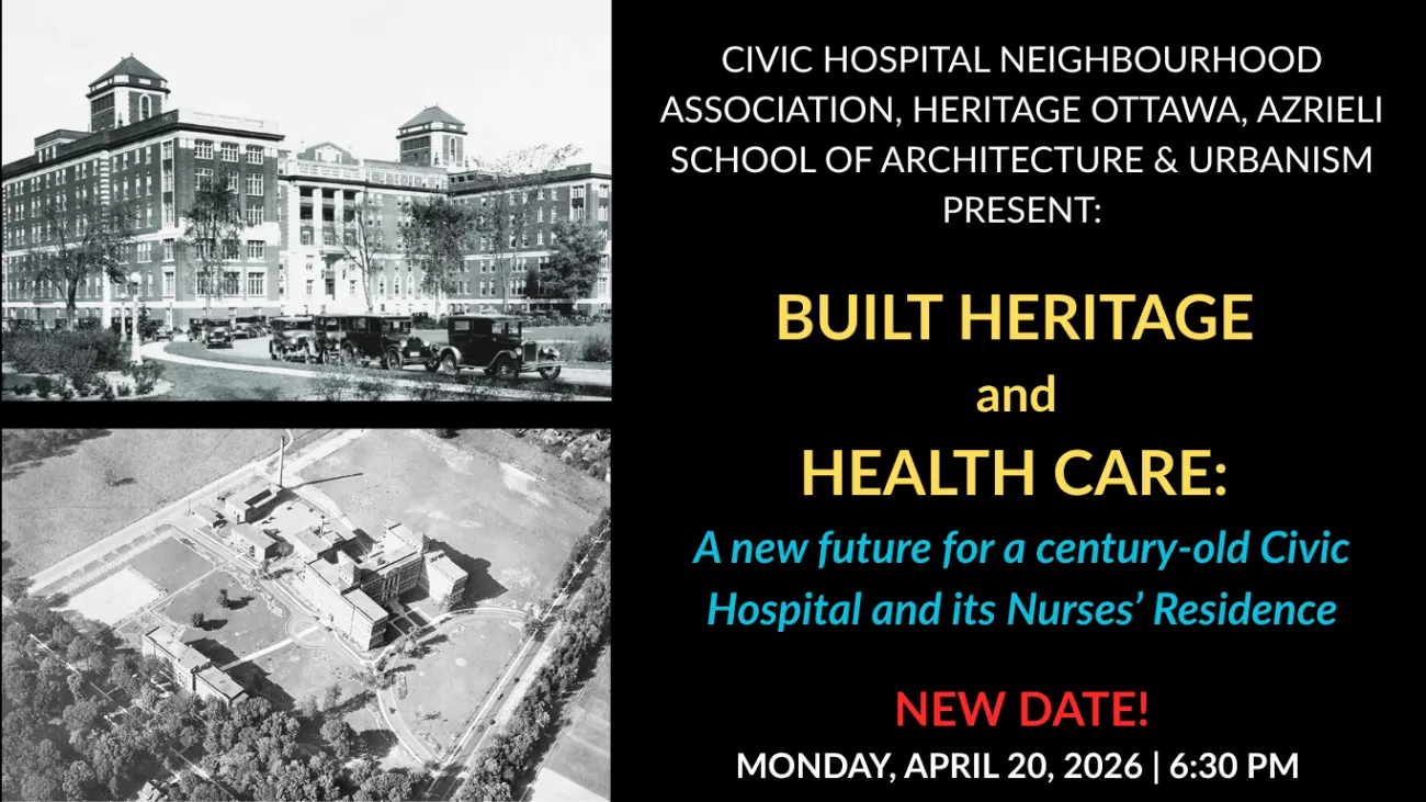 The Civic Hospital Neighbourhood Association is hosting, in collaboration with Heritage Ottawa and Carleton University’s Azrieli School of Architecture and Urbanism, an evening to raise awareness and open discussion on the future conservation and redevelopment of the original Civic Hospital and its former Nurses’ Residence, both built in 1924.