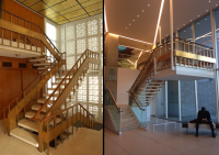Wood reclaimed from deconstructed airport hangars was used at the Ottawa Airport. Inset: Staircase from demolished Firestone House repurposed at new Ottawa Art Gallery. Images: Event Website