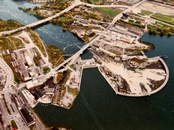 Chaudière Falls was once one of  Canada’s premier tourist attractions. Long before that, it was a sacred meeting site for First Nations. Since 1908, it has been dammed, first to provide power to the nearby paper mill and later to provide power to Hydro Ottawa. Today the ring dam generates enough energy to power 40,000 homes a year. Upgrades to its generating station that are now taking place will improve its efficiency to about 60,000 homes a year.
