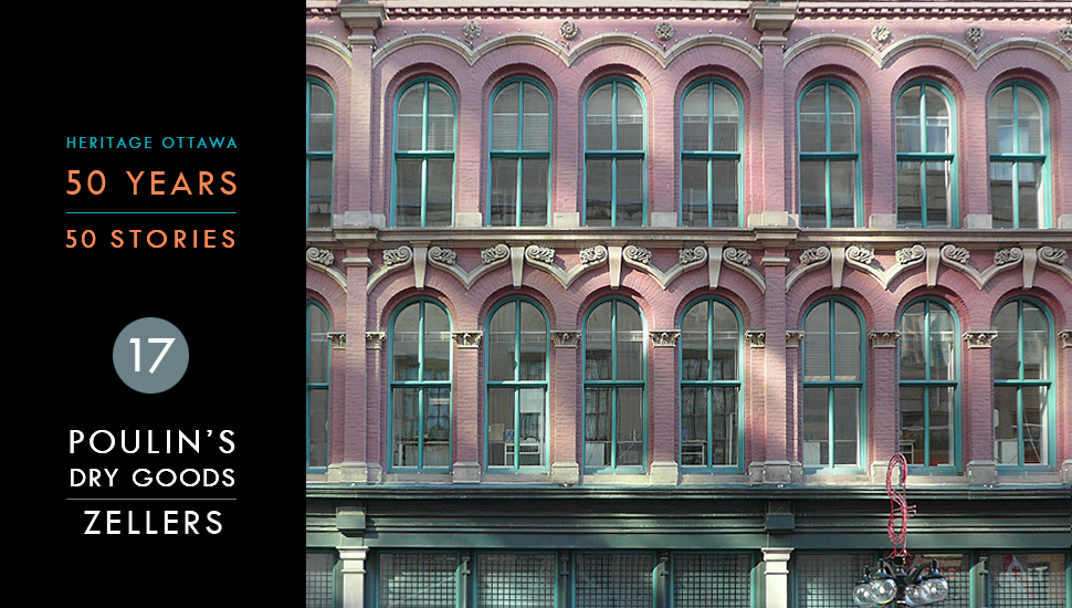 Window detail, upper two stories of the former Poulin's Dry Goods Store / Zellers Department Store at 156-158 Sparks Street, June 2017. Photo: D. Jones