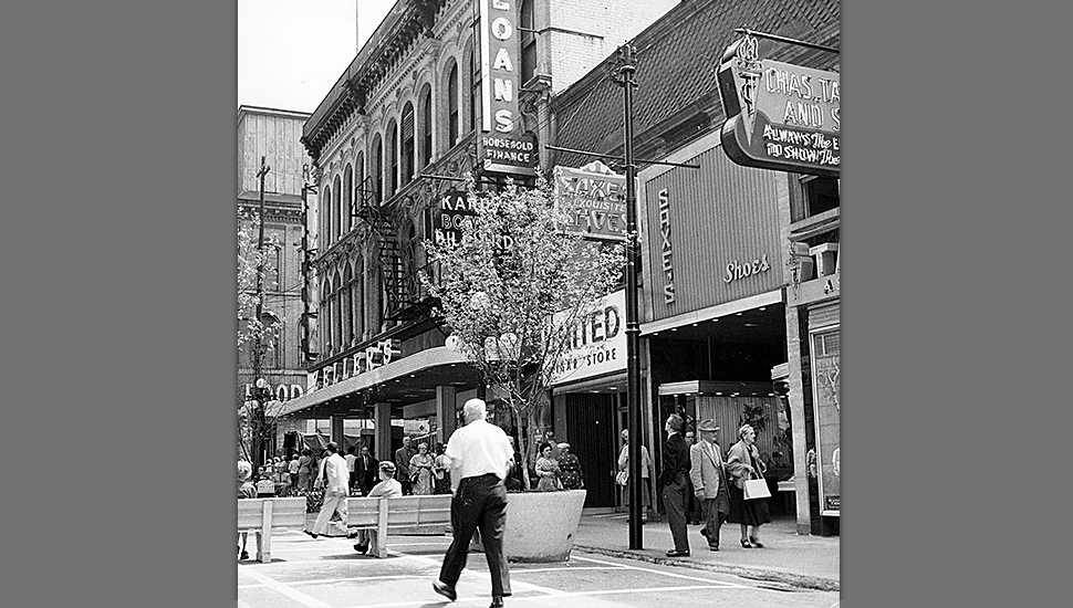 Sparks Street Mall in 1967. Zellers at 156-158 Sparks Street visible at left, with aluminum awning dating from the 1930's. Photo: City of Ottawa Archives, CA023122