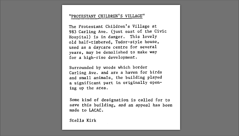 The threat to the preservation of the building intensified in October 1982, when the Protestant Children’s Village announced the sale of its property to Minto Construction.