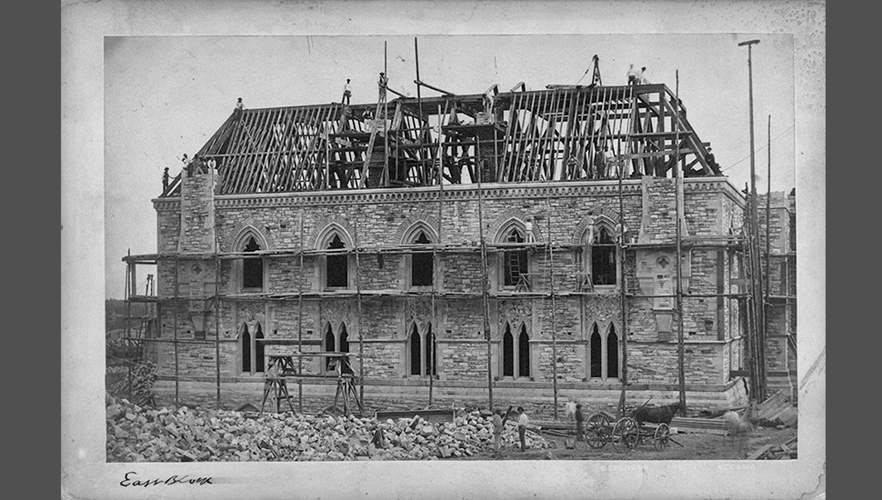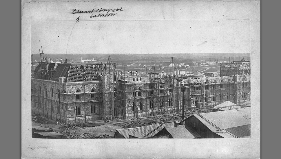 Construction of East Block, Parliament, October 1, 1861. Photo: Elihu Spencer / Library and Archives Canada / PA-103309