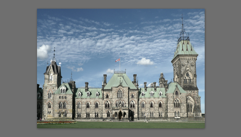 Positioned within a stunningly beautiful setting overlooking the locks of the Rideau Canal and the Ottawa River, the building is characterized by its asymmetrical massing, towered silhouette, coloured and highly textured stone surfaces, and gothic ornamentation.  The iron cresting and pinnacles are essential elements of the building's aesthetic design concept.