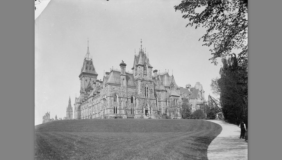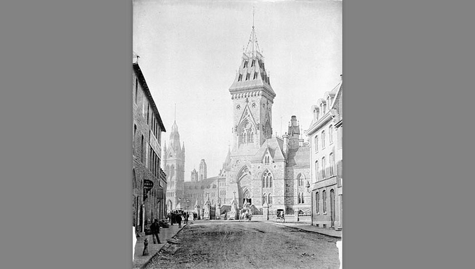 Partial view of East Block, Parliament with Centre Block visible in background, circa 1868. Photo: Samuel McLaughlin /  Library and Archives Canada / C-018369