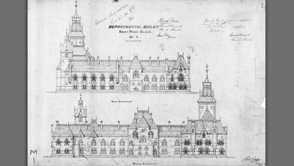 East Block, Parliament Buildings. 1863 Architectural Drawing, east and north elevations / R. Jones, E. Haycock and C. Clarke, Contractors / Library and Archives Canada
