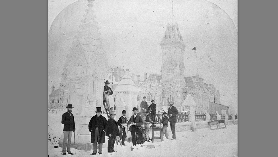 Group in front of main gate, Parliament with East Block in background, circa 1873-74. / Library and Archives Canada / C-000589