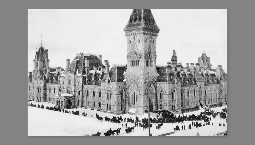 Crowds outside EastBlock Parliament Buildings 1870-1880 / Sandford Fleming fonds / Library and Archives Canada / PA-022392