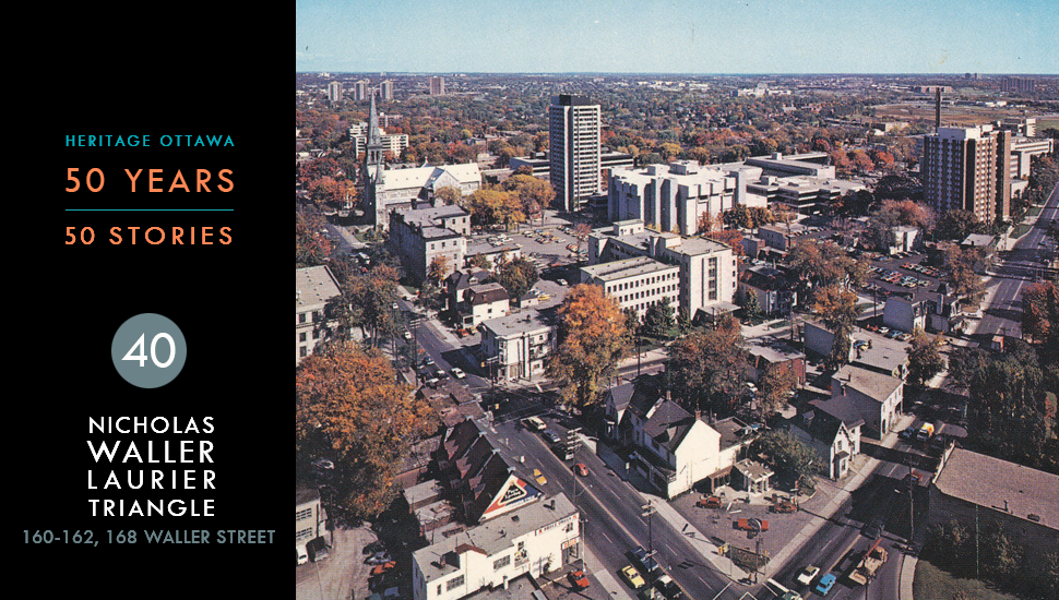Bounded by Nicholas and Waller streets and Laurier Avenue East, the triangular parcel of land known as the Nicholas-Waller-Laurier Triangle was considered a gateway into the historic neighbourhood of Sandy Hill. Numerous single and multi-family residential buildings, dating back to the late 19th and early 20th centuries, were still occupied as residences in the 1950s.