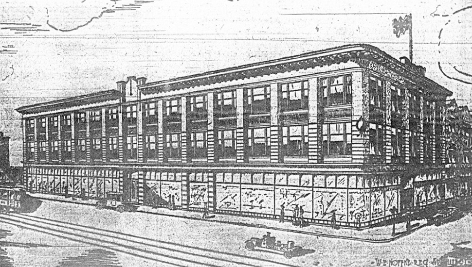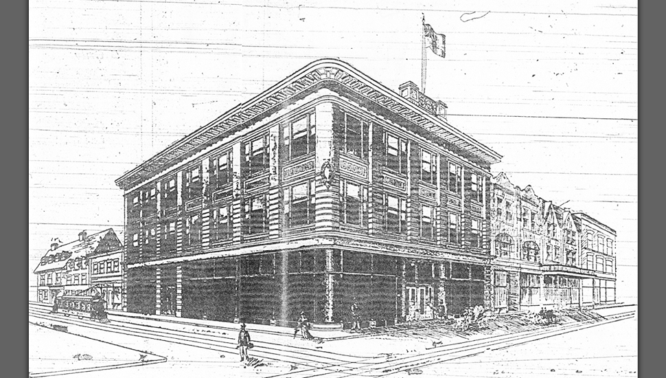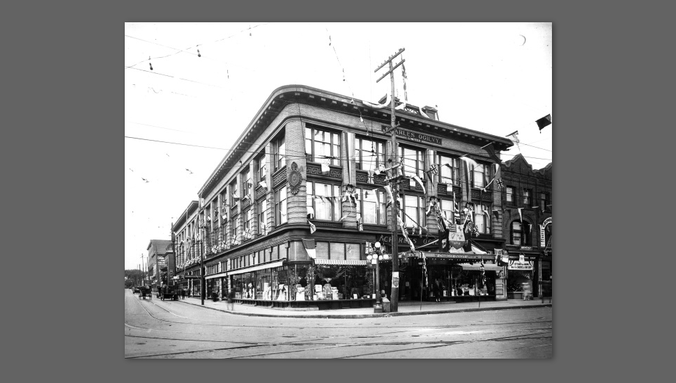The new Charles Ogilvy Limited Department Store, constructed in 1907, was one of Ottawa's first steel and concrete buildings. Designed by Ottawa architects Northwood and Noffke in the Classical Revival style and known simply as “Ogilvy’s”, the building was a prominent landmark anchoring the corner of Rideau and Nicholas streets.