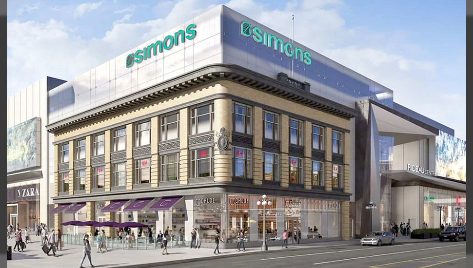 The reconstructed façades now clad the exterior of the Simons store, which faces onto Rideau Street and a new outdoor pedestrian mall.
