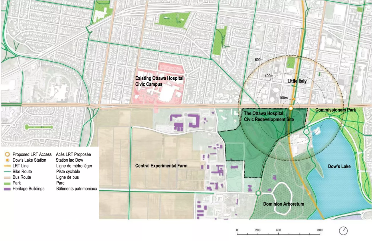 A development application has been filed to seek Master Site Plan approval from Planning Committee and City Council, and to remove the Holding Provisions from the subject Major Institutional Zone, Urban Exception 2491, holding (I2 [2491]-h). Individual site plan control applications will be submitted for City review and approval based on the proposed phasing of the hospital master plan.