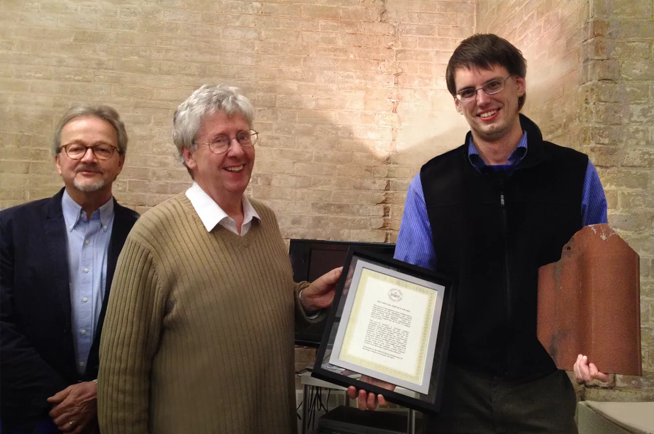 At last night's meeting of the Board of Directors, Heritage Ottawa member Peter Holdsworth was presented with a special award in appreciation of his outstanding volunteer service to Heritage Ottawa. Peter served as an assistant volunteer Tour Coordinator at all thirteen Walking Tours of the 2014 season, and is currently volunteering his time and talents to prepare spreadsheets and keywords for the entire Heritage Ottawa Newsletter Archive so that all newsletter content will soon be searchable on our new website.