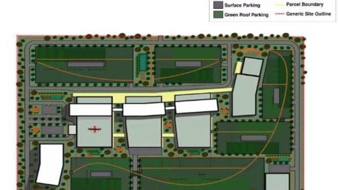 The proposal shows six substantial "green roof parking" structures, with a few smaller surface parking areas.