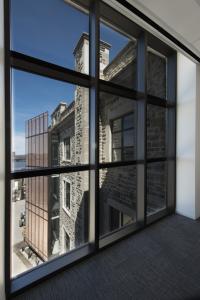 The glass of the “Beacon” is several layers thick. With copper mesh sandwiched between the panes to create a screen to filter light, it also has a further layer of black trefoils embossed on another pane. The copper is a nod to the copper accents and details found in the original archives building, while the trefoil is a motif that is repeated frequently – in carpets, light fixtures, and the gorgeous white oak laser cut panelling found in The Dialogue Centre. It is taken from the stone trefoil on the building’s parapet.
