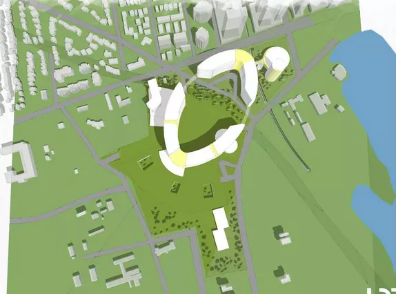 The Ottawa Hospital’s preliminary plan for a $2-billion Civic campus envisions an oval-shaped hospital that preserves the site’s mature trees and maintains generous open spaces.
