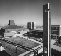 The complex included a dozen interconnected pavilions identified by their dark, rough brick surfaces and by their careful organization around four small courtyards with a chapel at its core. Among the buildings were a theatre, gymnasium, and cafeteria, all connected by glassed walkways and underground tunnels.